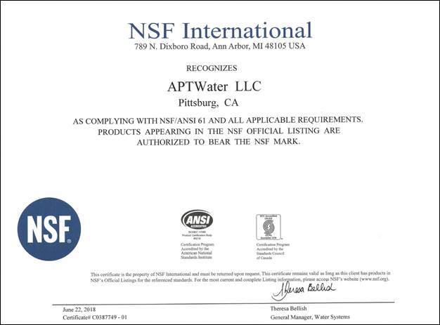 麥王環(huán)境美國全資子公司APTwater ARoNite技術獲得NSF技術認證